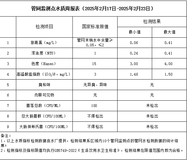 管網監測點水質周報表(2025年2月17日-2025年2月23日)