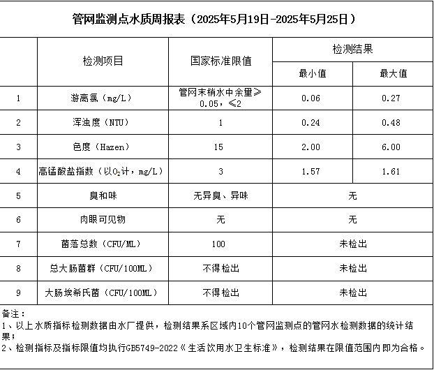 管網監測點水質周報表(2025年5月19日-2025年5月25日)