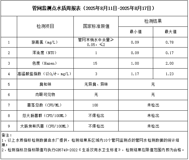 管網監測點水質周報表(2025年8月11日-2025年8月17日)