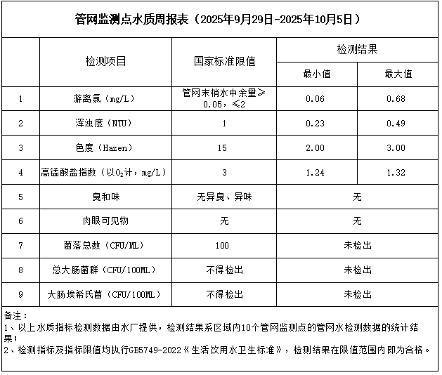 管網監測點水質周報表(2025年9月29日-2025年10月5日)