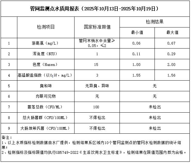 管網監測點水質周報表(2025年10月13日-2025年10月19日)