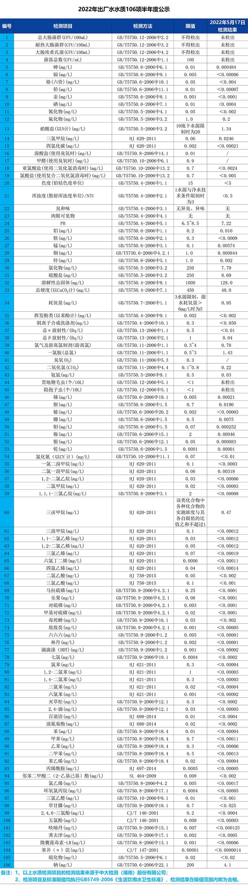 2022年出廠水水質106項半年度公示