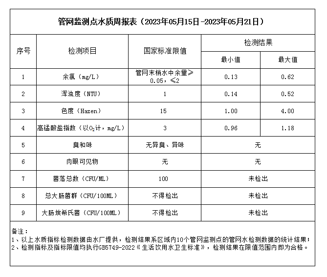 管網(wǎng)監(jiān)測點(diǎn)水質(zhì)周報(bào)表(2023年05月15日-2023年05月21日)