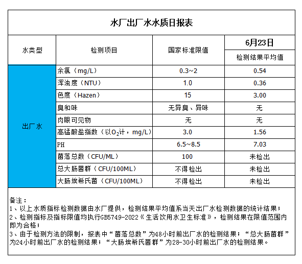 水廠出廠水水質(zhì)日報表(2023-6-23)