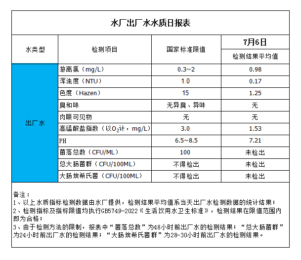 水廠出廠水水質(zhì)日?qǐng)?bào)表(2023-7-6)