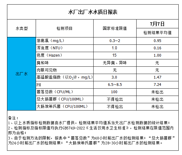 水廠出廠水水質(zhì)日?qǐng)?bào)表(2023-7-7)