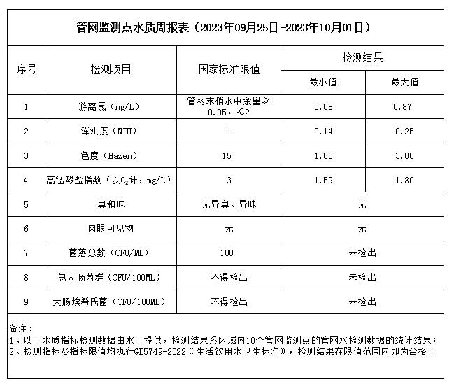 管網監測點水質周報表(2023年09月25日-2023年10月01日)