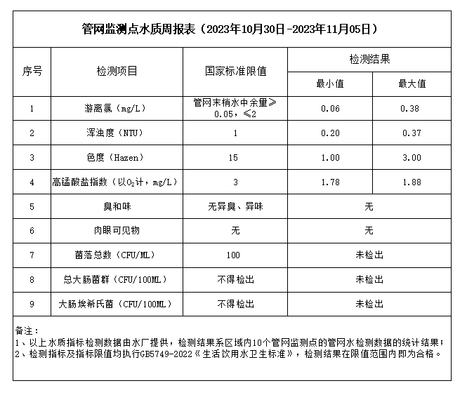 管網監測點水質周報表(2023年10月30日-2023年11月05日)