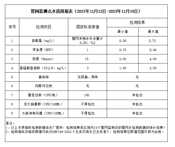 管網(wǎng)監(jiān)測點水質周報表(2023年11月13日-2023年11月19日)