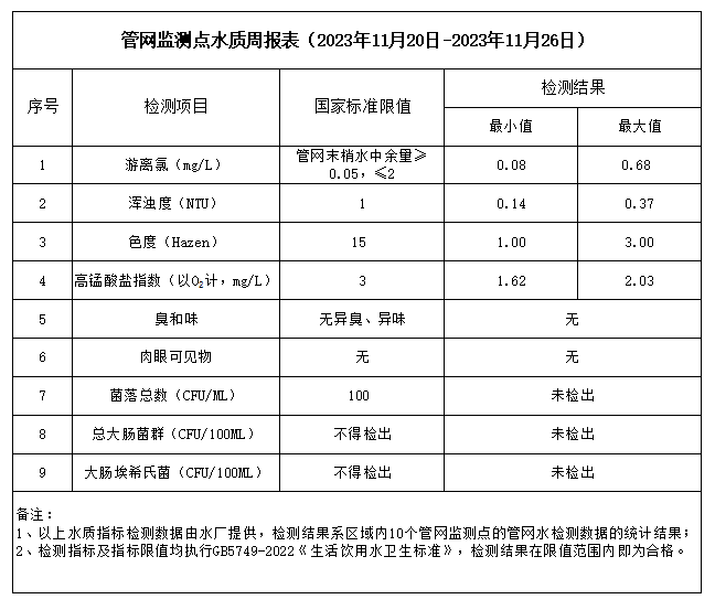 管網監測點水質周報表(2023年11月20日-2023年11月26日)