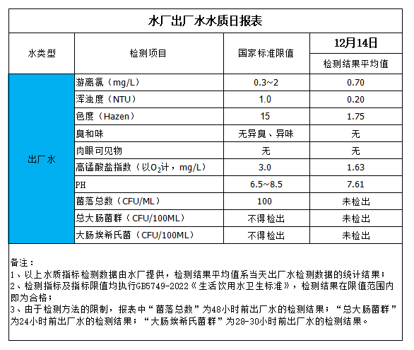 水廠出廠水水質(zhì)日?qǐng)?bào)表(2023-12-14)