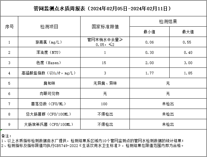 管網(wǎng)監(jiān)測(cè)點(diǎn)水質(zhì)周報(bào)表(2024年02月05日-2024年02月11日)