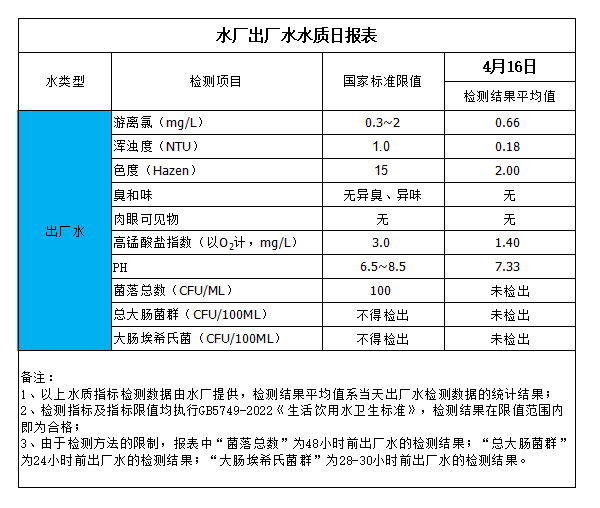 水廠出廠水水質(zhì)日報表(2024-4-16)