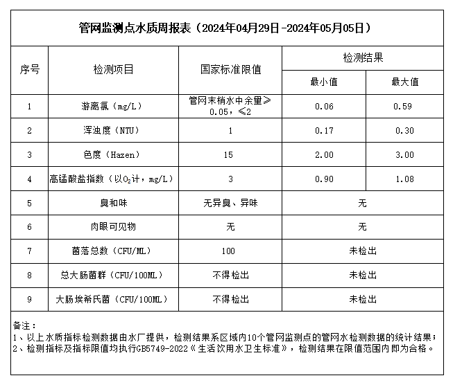 管網監測點水質周報表(2024年04月29日-2024年05月05日)