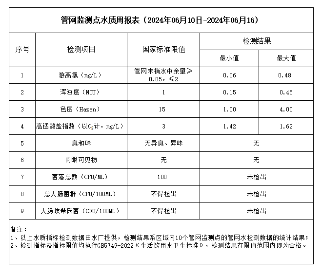管網監測點水質周報表(2024年06月10日-2024年06月16)
