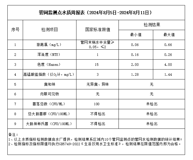 管網(wǎng)監(jiān)測點水質(zhì)周報表(2024年8月5日-2024年8月11日)