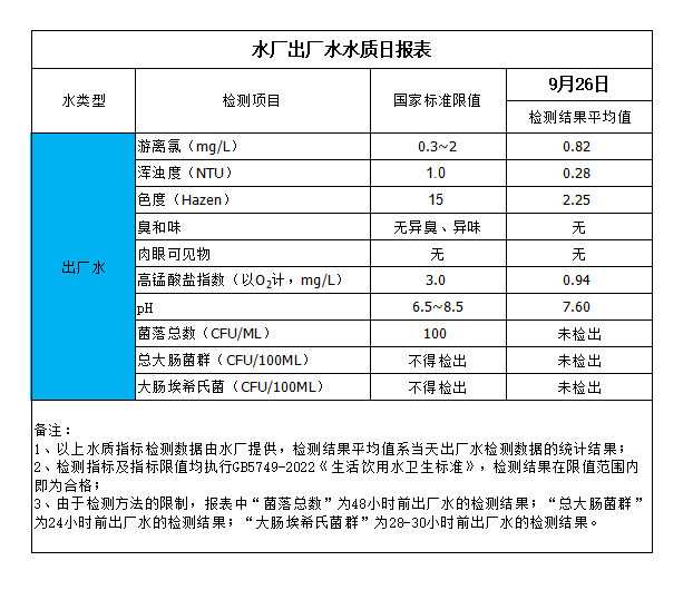 水廠出廠水水質(zhì)日?qǐng)?bào)表(2024-9-26)